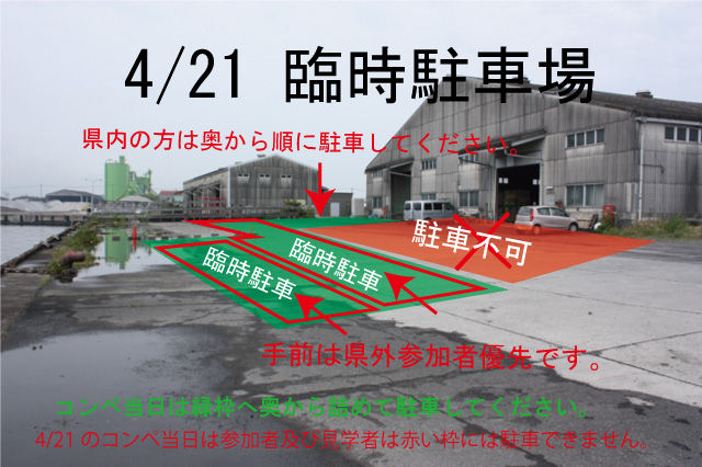 ※遠方からご来店される方で前日夜から駐車される方は港側奥へ駐車してください。 コンペ当日の朝にスタッフから指示された場所へ移動して頂きます。
